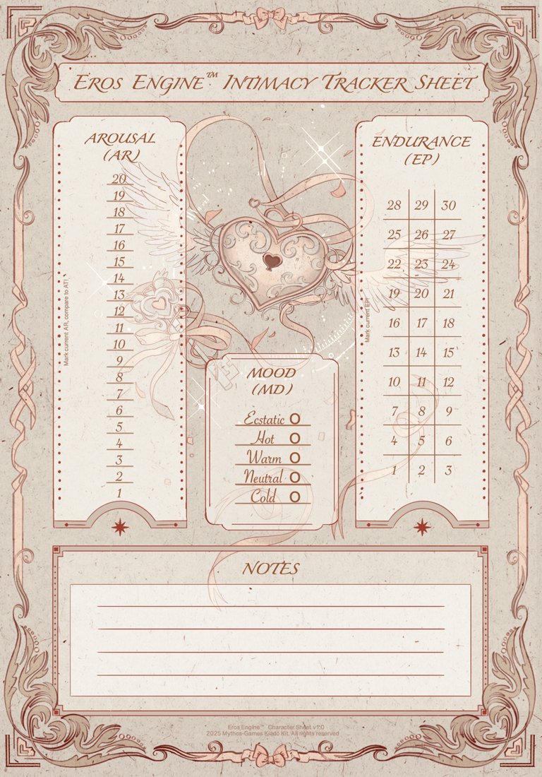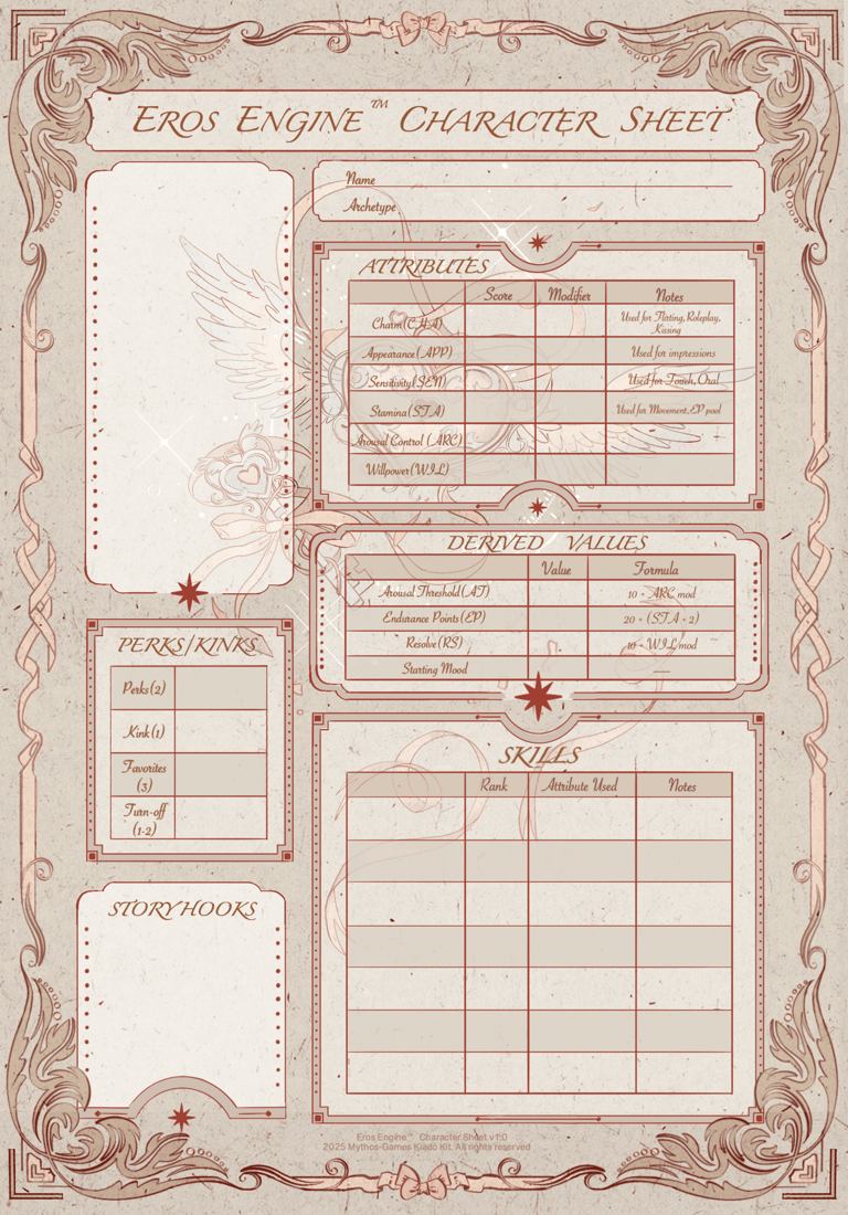 We’re excited to announce a brand-new addition to your Eros Engine™ toolkit: a fillable, printable character sheet with an integrated intimacy tracker — ready to streamline your play and bring even more clarity and immersion to your sessions.